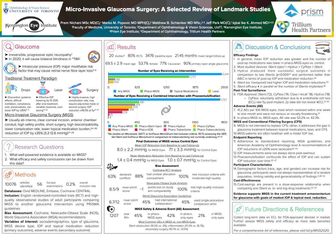 Methods: A review of MIGS was conducted by searching Ovid MEDLINE, EMBASE, and Cochrane CENTRAL (2006 to 2019). The primary efficacy indicators were reductions in intraocular pressure (IOP) and topical medication use postoperatively. Adverse event analysis was conducted; risk of bias assessment was performed using the Cochrane, Newcastle-Ottawa, and World Glaucoma Association recommendations.